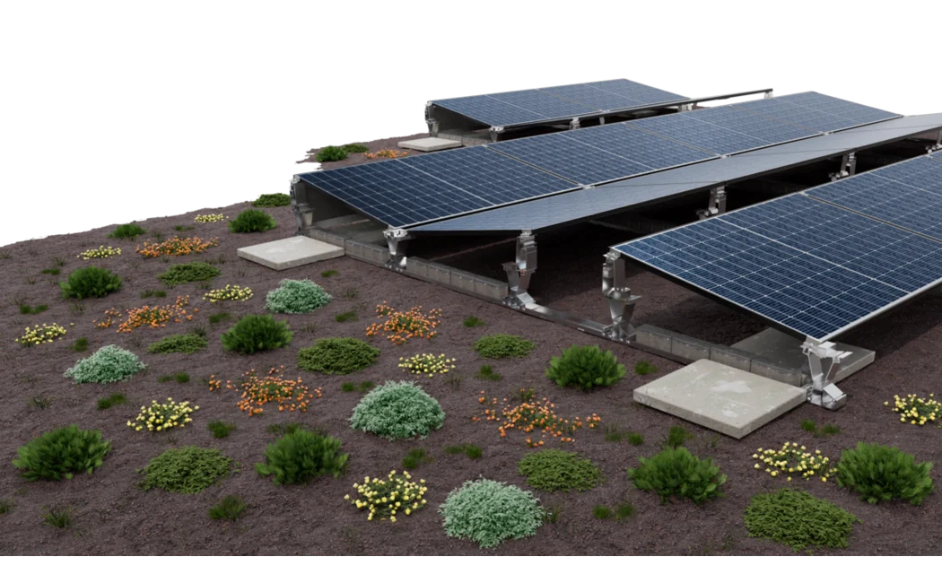 Du planst flexibel: Ost-West-Aufbau in Schmetterlingsformation für hohe Flächenausnutzung oder Einzelreihen zur optimalen Südausrichtung, sowie zur Anlagenerweiterung im absturzgefährdeten Bereich der Attika. Das System ist für intensive und extensive Gründächer geeignet, im Neubau wie in der Nachrüstung.